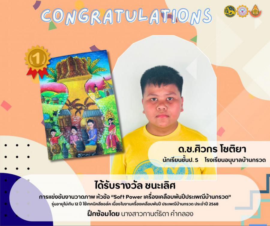 แข่งขันงานวาดภาพ หัวข้อ Soft Power เครื่องเคลือบพันปีประเพณีบ้านกรวด รุ่นอายุไม่เกิน 12 ปี ใช้เทคนิคสีชอล์ค เนื่องในงานเครื่องเคลือบพันปี ประเพณีบ้านกรวด ประจำปี 2568