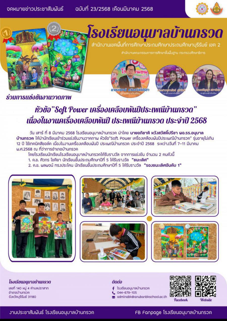 วันที่เสาร์ 8 มีนาคม 2568 โรงเรียนอนุบาลบ้านกรวด ได้นำนักเรียนเข้าร่วมแข่งขันงานวาดภาพ หัวข้อ Soft Power เครื่องเคลือบพันปีประเพณีบ้านกรวด รุ่นอายุไม่เกิน 12 ปี ใช้เทคนิคสีชอล์ค เนื่องในงานเครื่องเคลือบพันปี ประเพณีบ้านกรวด ประจำปี 2568 ระหว่างวันที่ 7-11 มีนาคม พ.ศ.2568 ณ ที่ว่าการอำเภอบ้านกรวด โดยนักเรียนโรงเรียนอนุบาลบ้านกรวดได้รับรางวัล จากการแข่งขัน จำนวน 2 คนดังนี้ 1. ด.ช. ศิวกร โชติยา นักเรียนชั้นประถมศึกษาปีที่ 5 ได้รับรางวัล ชนะเลิศ ฝึกซ้อมโดย นางสาวกานต์ธิดา คำกลอง 2. ด.ช. พลพจน์ ทรงประโคน นักเรียนชั้นประถมศึกษาปีที่ 5 ได้รับรางวัล รองชนะเลิศอันดับ 1 ฝึกซ้อมโดย นางสาวยมลกร จำนงมี อำนวยการฝึกซ้อมโดย ผอ.อภิชาติ หวังสวัสดิ์ปรีชา S:0
