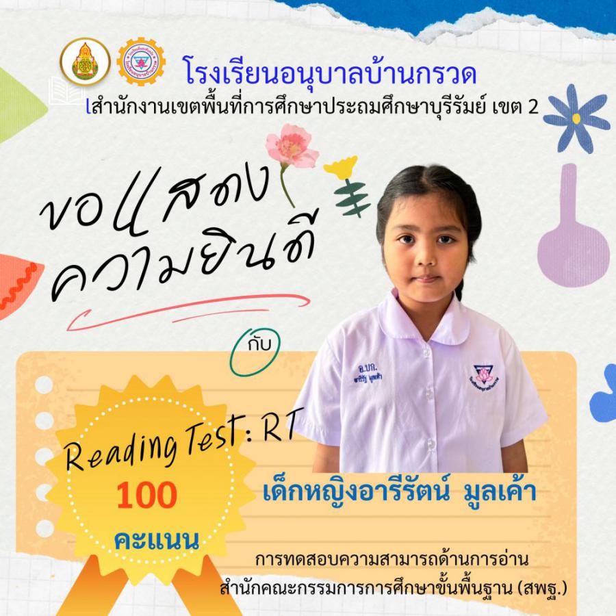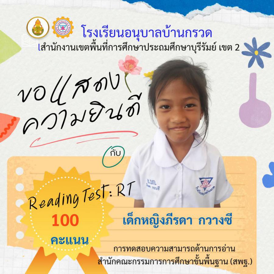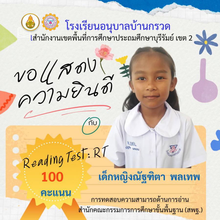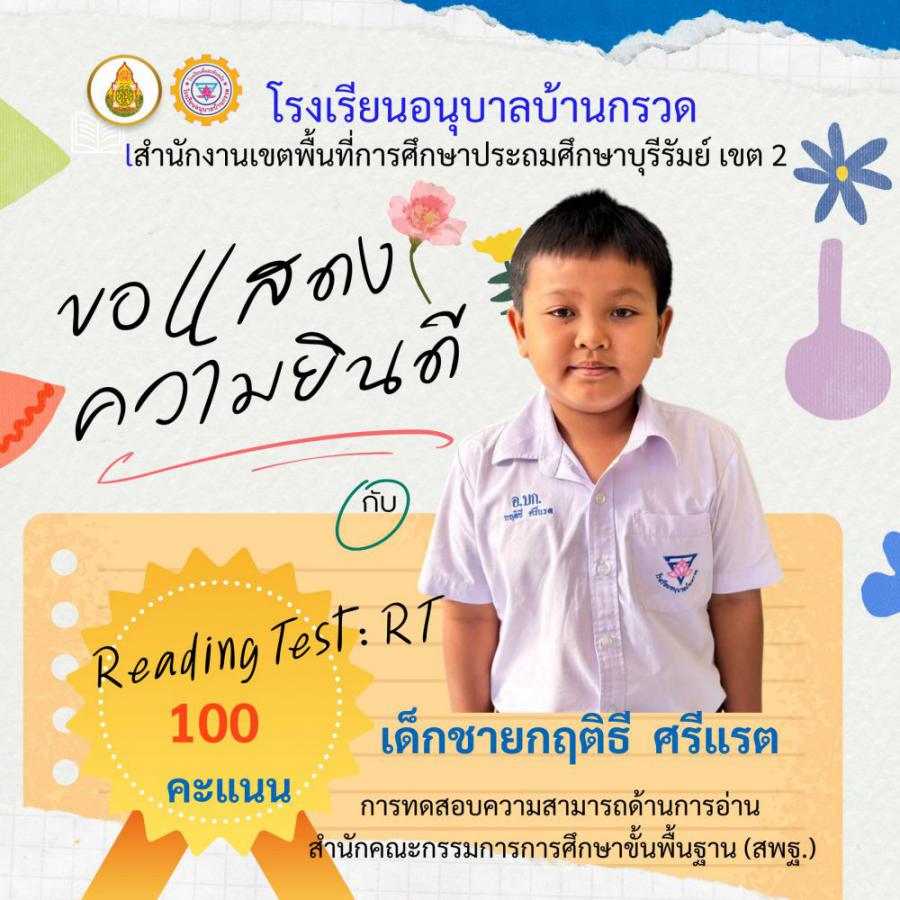 โรงเรียนอนุบาลบ้านกรวด ขอแสดงความยินดีนักเรียนชั้นประถมศึกษาปีที่ 1 ที่มีผลการทดสอบความสามารถด้านการอ่าน (Reading test : RT) 100 คะแนนเต็ม จำนวน 12 คน S:0