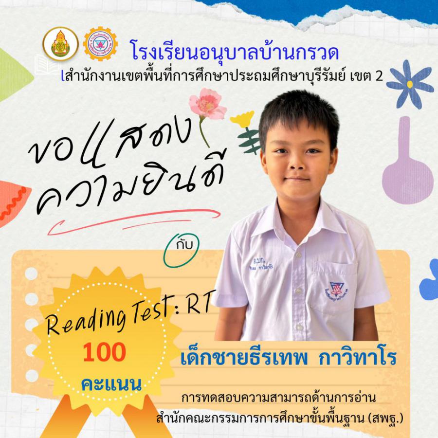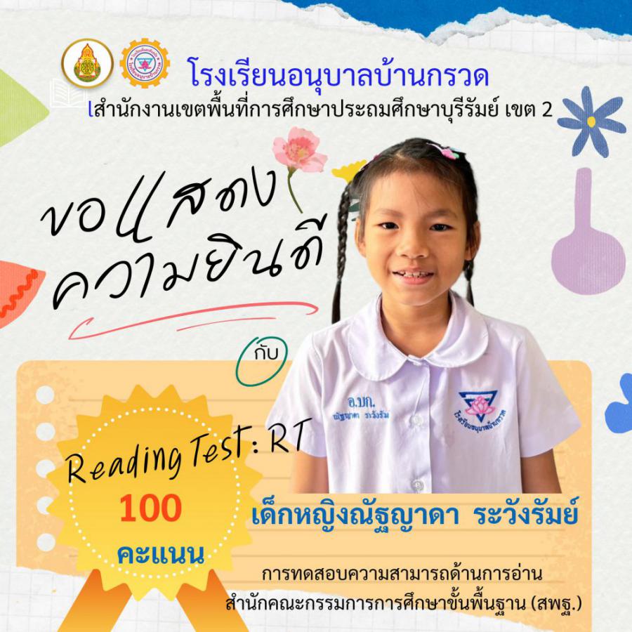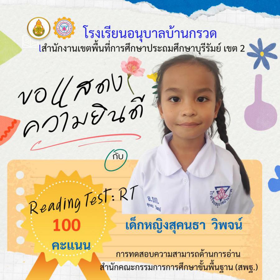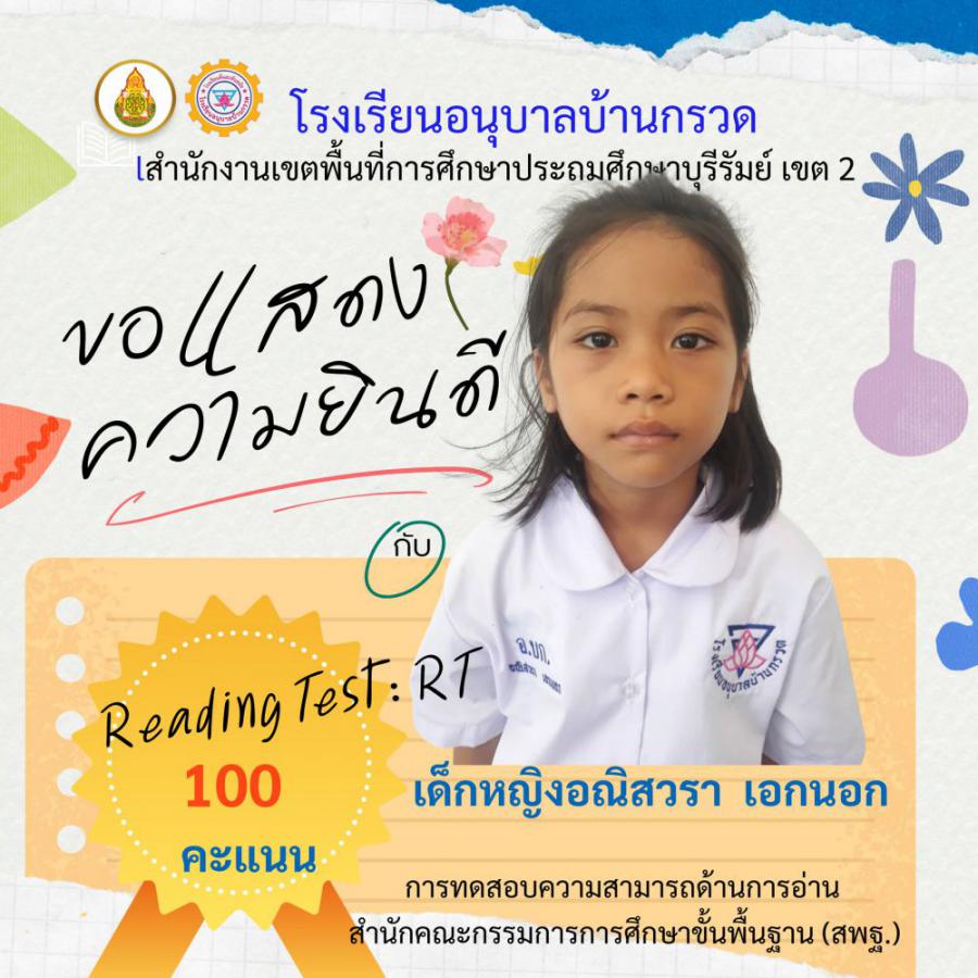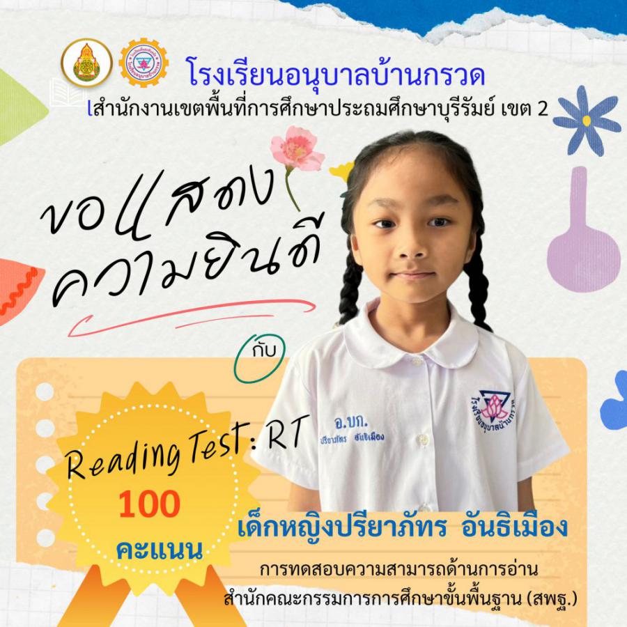 โรงเรียนอนุบาลบ้านกรวด ขอแสดงความยินดีนักเรียนชั้นประถมศึกษาปีที่ 1 ที่มีผลการทดสอบความสามารถด้านการอ่าน (Reading test : RT) 100 คะแนนเต็ม จำนวน 12 คน S:0