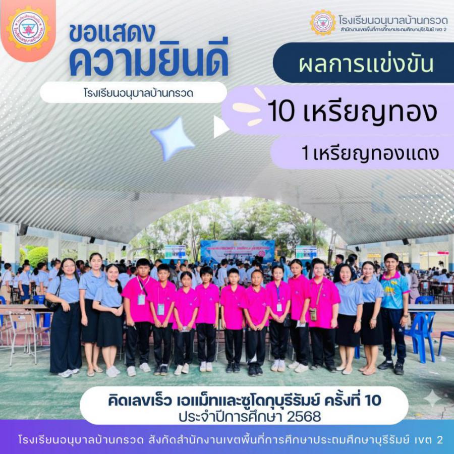 วันที่ 12 -13 กันยายน 2568 โรงเรียนอนุบาลบ้านกรวดนำนักเรียนเข้าร่วมการแข่งขัน สูตรคูณเร็ว ซูโดกุ และเวทคณิต รายการ ? คิดเลขเร็ว เอแม็ทและซูโดกุบุรีรัมย์ครั้งที่ 10 ประจำปีการศึกษา 2568 ? เพื่อพัฒนาทักษะกระบวนการทางคณิตศาสตร์ ด้วยความมุ่งหวังที่จะส่งเสริมให้นักเรียนมีทักษะที่ดีเยี่ยมและสามารถแข่งขันในระดับสูงได้ กิจกรรมนี้ไม่เพียงแต่เป็นโอกาสในการแสดงความสามารถ แต่ยังเป็นการสร้างความสนุกสนานและความท้าทายที่น่าตื่นเต้นสำหรับนักเรียนอีกด้วย นักเรียนที่เข้าร่วมได้รับการเตรียมความพร้อมจากคุณครูผู้ฝึกซ้อม และได้รับการสนับสนุนจากผู้ปกครองอย่างเต็มที่ งานนี้ไม่เพียงแต่จะช่วยพัฒนาความสามารถด้านคณิตศาสตร์ของนักเรียนเท่านั้น แต่ยังเสริมสร้างความมั่นใจและความรักในการเรียนรู้ที่มีค่าอย่างยิ่งในอนาคต S:0