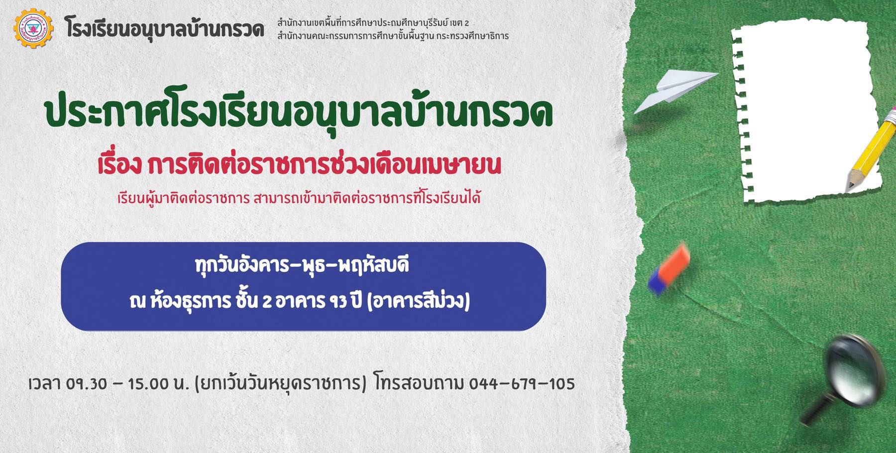 ประกาศโรงเรียนอนุบาลบ้านกรวด เรื่อง การติดต่อราชการช่วงเดือนเมษายน