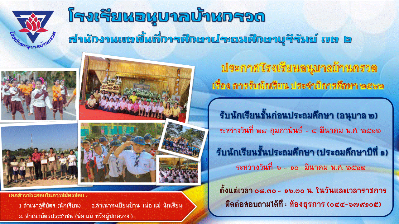 โรงเรียนอนุบาลบ้านกรวด กำหนดปฏิทินการรับนักเรียน ปีการศึกษา 2562 โดยรับสมัครนักเรียนชั้นอนุบาลปีที่ 2 (4 ปี) และชั้นประถมศึกษาปีที่ 1 ดังนี้