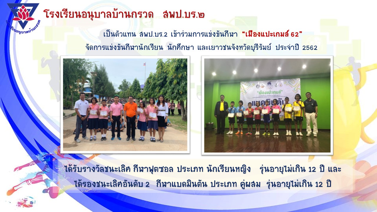 การศึกษาประถมศึกษาบุรีรัมย์ เขต๒  เข้าร่วมการแข่งขันกีฬา “เมืองแปะเกมส์ 62” ซึ่งกำหนดจัดการแข่งขันระหว่างวันที่  10 – 20 สิงหาคม2562 การจัดการแข่งขันกีฬานักเรียน นักศึกษา และเยาวชนจังหวัดบุรีรัมย์ ประจำปี 2562