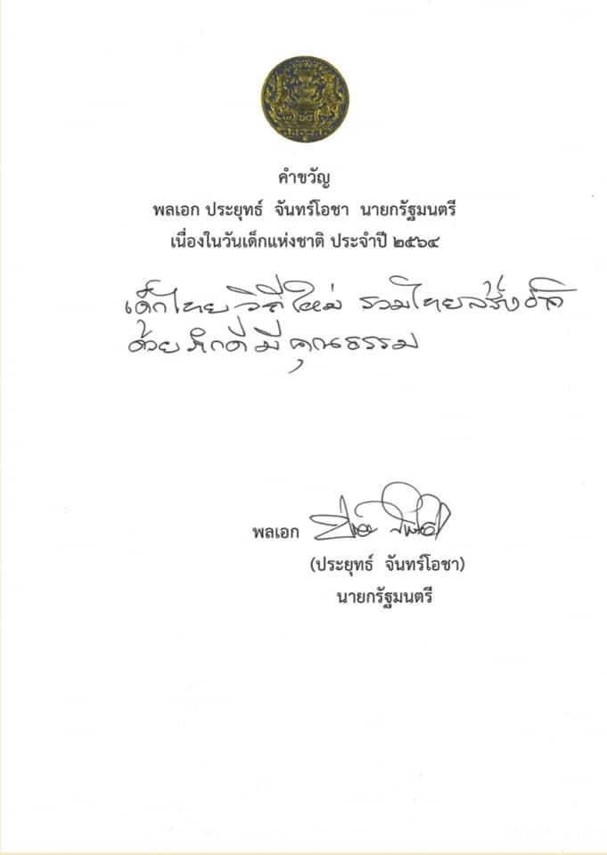 คําขวัญวันเด็ก 2564 จากท่าน พลเอก ประยุทธ์ จันทร์โอชา นายกรัฐมนตรี