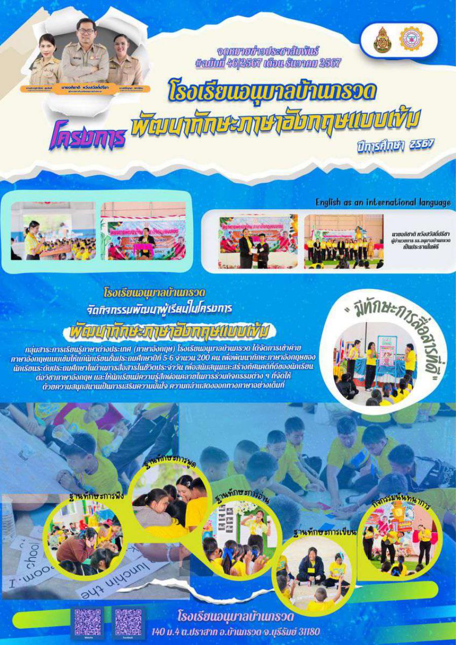 ภาษาอังกฤษแบบเข้มให้แก่นักเรียนชั้นประถมศึกษาปีที่ 5-6 จำนวน 200 คน เพื่อพัฒนาทักษะภาษาอังกฤษของนักเรียนระดับประถมศึกษาในด้านการสื่อสารในชีวิตประจำวัน ทั้งทักษะการฟัง การพูด การอ่าน และการเขียน เพื่อสนับสนุนและสร้างทัศนคติที่ดีของนักเรียนต่อวิชาภาษาอังกฤษ และให้นักเรียนมีความรู้สึกผ่อนคลายในการร่วมกิจกรรมต่าง ๆ ที่จัดให้ด้วยความสนุกสนานเป็นการเสริมความมั่นใจ ความกล้าแสดงออกทางภาษาอย่างเต็มที่