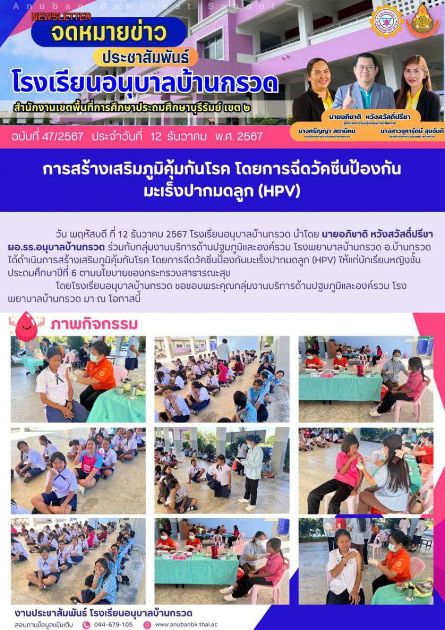 วัน พฤหัสบดี ที่ 12 ธันวาคม 2567 โรงเรียนอนุบาลบ้านกรวด ร่วมกับกลุ่มงานบริการด้านปฐมภูมิและองค์รวม โรงพยาบาลบ้านกรวด อ.บ้านกรวด ได้ดำเนินการสร้างเสริมภูมิคุ้มกันโรค โดยการฉีดวัคซีนป้องกันมะเร็งปากมดลูก (HPV) ให้แก่นักเรียนหญิงชั้นประถมศึกษาปีที่ 6 ตามนโยบายของกระทรวงสาธารณะสุข