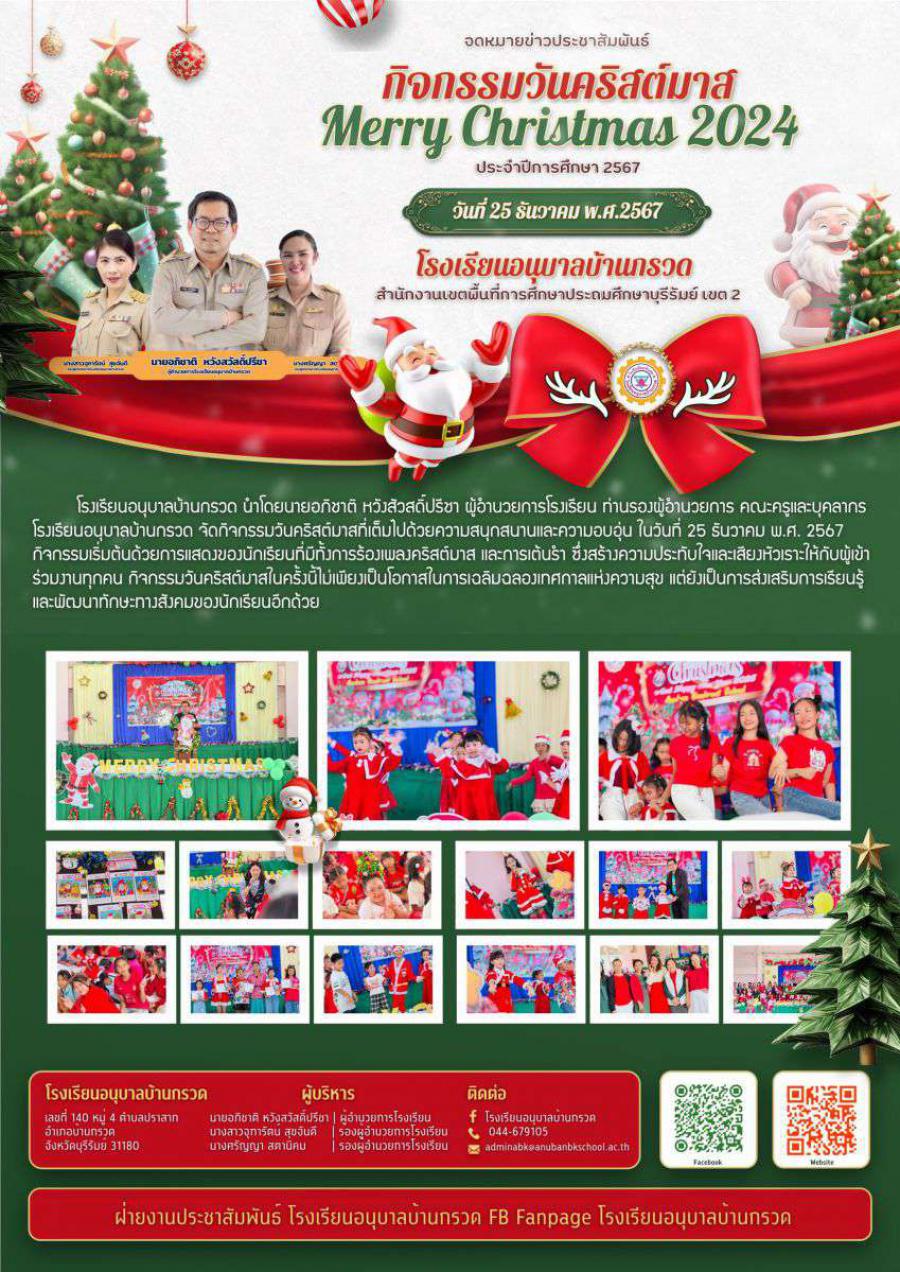 โรงเรียนอนุบาลบ้านกรวด นำโดยนายอภิชาติ หวังสัวสดิ์ปรีชา ผู้อำนวยการโรงเรียน ท่านรองผู้อำนวยการ คณะครูและบุคลากรโรงเรียนอนุบาลบ้านกรวด จัดกิจกรรมวันคริสต์มาสที่เต็มไปด้วยความสนุกสนานและความอบอุ่น ในวันที่ 25 ธันวาคม พ.ศ. 2567 กิจกรรมเริ่มต้นด้วยการแสดงของนักเรียนที่มีทั้งการร้องเพลงคริสต์มาส และการเต้นรำ ซึ่งสร้างความประทับใจและเสียงหัวเราะให้กับผู้เข้าร่วมงานทุกคน กิจกรรมวันคริสต์มาสในครั้งนี้ไม่เพียงเป็นโอกาสในการเฉลิมฉลองเทศกาลแห่งความสุข แต่ยังเป็นการส่งเสริมการเรียนรู้ และพัฒนาทักษะทางสังคมของนักเรียนอีกด้วย