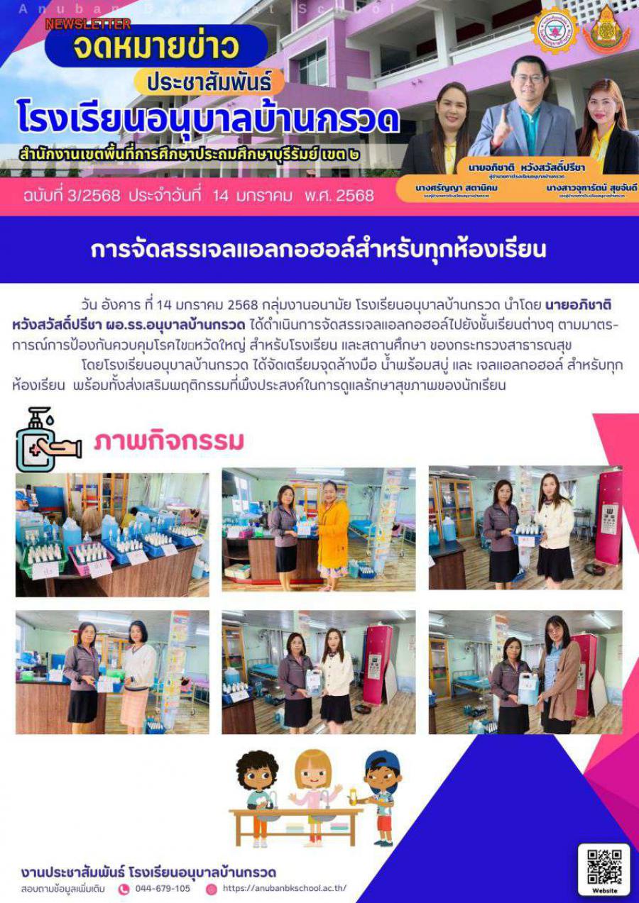 วัน อังคาร ที่ 14 มกราคม 2568 โรงเรียนอนุบาลบ้านกรวด ได้ดำเนินการจัดสรรเจลแอลกอฮอล์ไปยังชั้นเรียนต่างๆ ตามมาตรการณ์การป้องกันควบคุมโรคไข้หวัดใหญ่ สําหรับโรงเรียน และสถานศึกษา ของกระทรวงสาธารณสุขโดยได้จัดเตรียมจุดล้างมือ น้ำพร้อมสบู่ และ เจลแอลกอฮอล์ สำหรับทุกห้องเรียน พร้อมทั้งส่งเสริมพฤติกรรมที่พึงประสงค์ในการดูแลรักษาสุขภาพของนักเรียน
