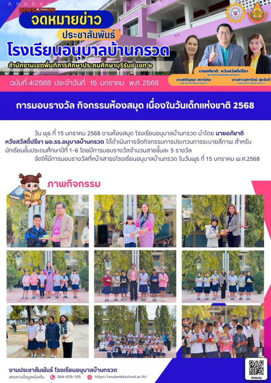 วัน พุธ ที่ 15 มกราคม 2568 งานห้องสมุด โรงเรียนอนุบาลบ้านกรวด ได้ดำเนินการจัดกิจกรรมการประกวนการระบายสีภาพ สำหรับนักเรียนชั้นประถมศึกษาปีที่ 1-6 โดยมีการมอบรางวัลจำนวนสายชั้นละ 5 รางวัล