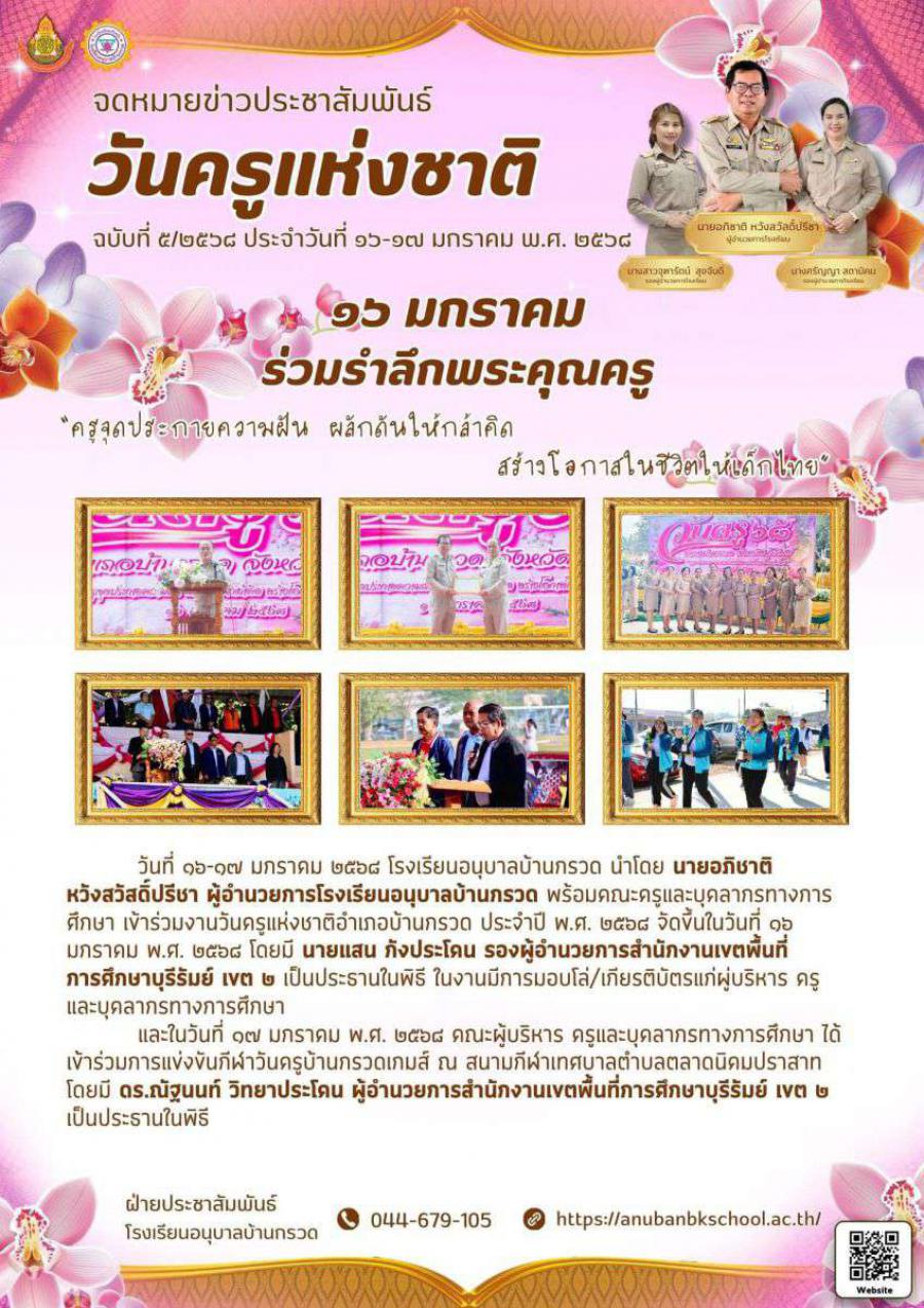 วันที่ 16-17 มกราคม 2568 คณะผู้บริหาร ครูและบุคลากรทางการศึกษาโรงเรียนอนุบาลบ้านกรวด เข้าร่วมงานวันครูแห่งชาติอำเภอบ้านกรวด ประจำปี พ.ศ. 2568 จัดขึ้นในวันที่ 16 มกราคม พ.ศ. 2568 โดยมี นายแสน กังประโคน รองผู้อำนวยการสำนักงานเขตพืื้นที่การศึกษาบุรีรัมย์ เขต 2 เป็นประธานในพิธี ในงานมีการมอบโล่/เกียรติบัตรแก่ผู่บริหาร ครูและบุคลากรทางการศึกษา