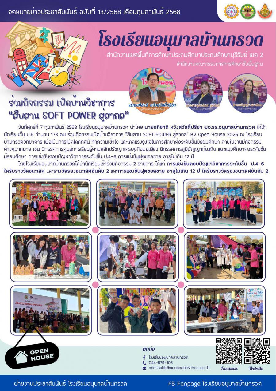 วันที่ศุกร์ 7 กุมภาพันธ์ 2568 โรงเรียนอนุบาลบ้านกรวด นำนักเรียนเข้าร่วมกิจกรรมเปิดบ้านวิชาการ “สืบสาน SOFT POWER สู่สากล“ BV Open House 2025 ณ โรงเรียนบ้านกรวดวิทยาคาร