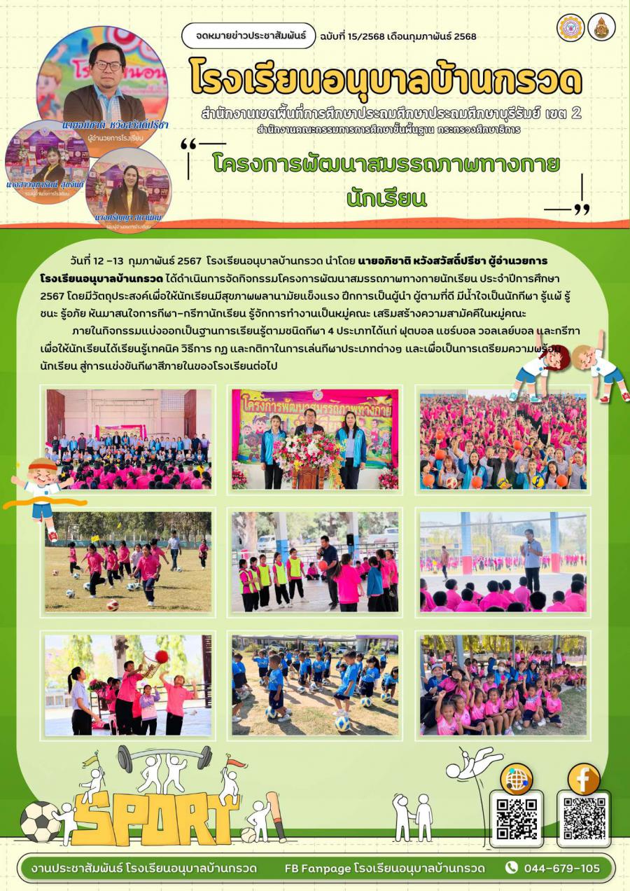 วันที่ 12-13 กุมภาพันธ์ 2568 โรงเรียนอนุบาลบ้านกรวด ได้ดำเนินการจัดกิจกรรมโครงการพัฒนาสมรรถภาพทางกายนักเรียน ประจำปีการศึกษา 2567 กิจกรรมแบ่งออกเป็นฐานการเรียนรู้ตามชนิดกีฬา 4 ประเภทได้แก่ ฟุตบอล แชร์บอล วอลเลย์บอล และกรีฑา เพื่อให้นักเรียนได้เรียนรู้เทคนิค วิธีการ กฏ และกติกาในการเล่นกีฬาประเภทต่างๆ และเพื่อเป็นการเตรียมความพร้อมนักเรียน สู่การแข่งขันกีฬาสีภายในของโรงเรียนต่อไป