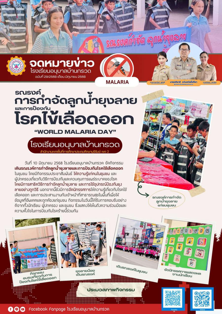 วันที่ 10 มิถุนายน 2568 โรงเรียนอนุบาลบ้านกรวด จัดกิจกรรมเดินรณรงค์การกำจัดลูกน้ำยุงลายและการป้องกันโรคไข้เลือดออกในชุมชน โดยมีกิจกรรมประชาสัมพันธ์ ให้ความรู้แก่คนในชุมชน และผู้ปกครองเกี่ยวกับวิธีการป้องกันและควบคุมการแพร่ระบาดของโรค โดยมีการสาธิตวิธีการกำจัดลูกน้ำยุงลาย และการใช้อุปกรณ์ป้องกันยุงลายอย่างถูกวิธี นอกจากนี้ยังมีการจัดนิทรรศการให้ความรู้เกี่ยวกับโรคไข้เลือดออก และการประสานงานกับเจ้าหน้าที่สาธารณสุขในพื้นที่เพื่อให้ข้อมูลที่อัพเดตและถูกต้องแก่ชุมชน กิจกรรมในวันนี้ได้รับการตอบรับอย่างดีจากทั้งนักเรียน ผู้ปกครอง และชุมชน ซึ่งแสดงให้เห็นถึงความร่วมมือและความตั้งใจในการป้องกันโรคร้ายนี้ร่วมกัน