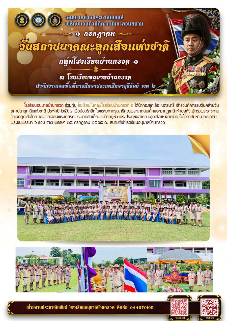 วันที่ 1 กรกฎาคม 2567 โรงเรียนอนุบาลบ้านกรวด ร่วมกับ โรงเรียนในกลุ่มโรงเรียนบ้านกรวด 1 ได้นำกองลูกเสือ เนตรนารี เข้าร่วมกิจกรรมวันคล้ายวันสถาปนาลูกเสือแห่งชาติ ประจำปี 2568 เพื่อน้อมรำลึกในพระมหากรุณาธิคุณพระบาทสมเด็จพระมงกุฎเกล้าเจ้าอยู่หัว ผู้ทรงพระราชทานกำเนิดลูกเสือไทย และเพื่อเฉลิมพระเกียรติพระบาทสมเด็จพระเจ้าอยู่หัว พระประมุขของคณะลูกเสือแห่งชาติเนื่องในโอกาสมหามงคลเฉลิมพระชนพรรษา 6 รอบ 72 พรรษา 28 กรกฏาคม 2568