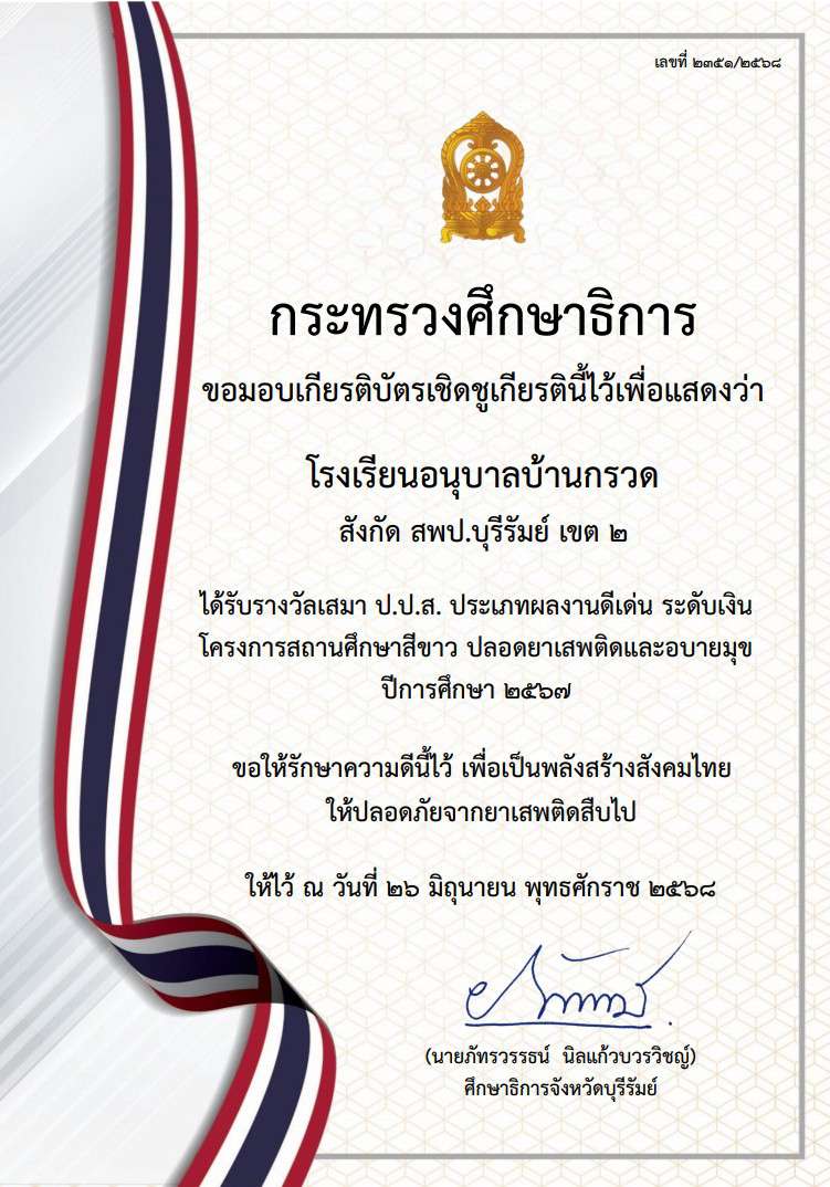 ขอแสดงความยินดีกับ โรงเรียนอนุบาลบ้านกรวด ที่ผ่านการประเมินได้รับรางวัล
