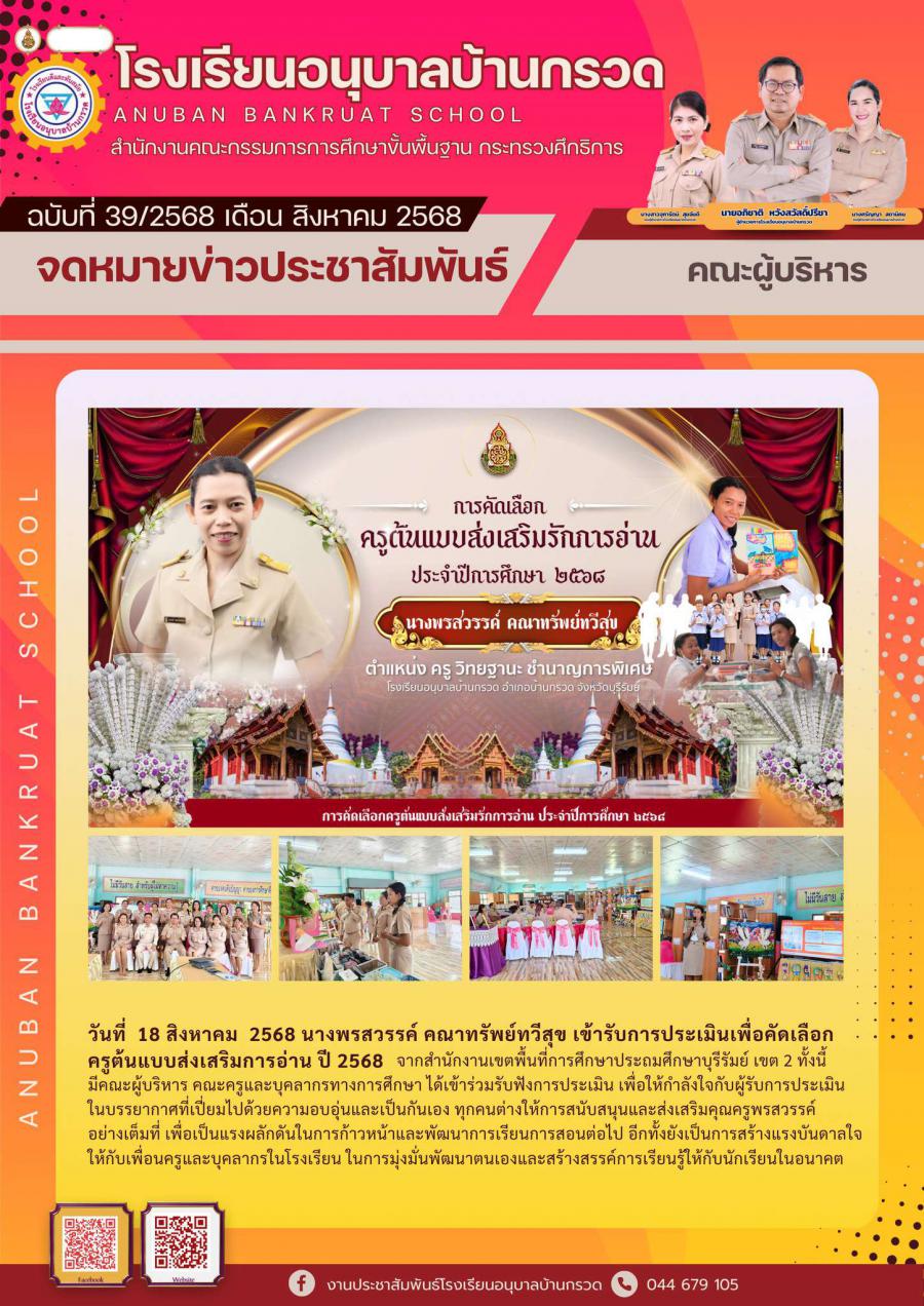 วันที่ 18 สิงหาคม 2568 นางพรสวรรค์ คณาทรัพย์ทวีสุข เข้ารับการประเมินเพื่อคัดเลือกครูต้นแบบส่งเสริมการอ่าน ปี 2568 จากสำนักงานเขตพื้นที่การศึกษาประถมศึกษาบุรีรัมย์ เขต 2 ทั้งนี้มีคณะผู้บริหาร คณะครูและบุคลากรทางการศึกษา ได้เข้าร่วมรับฟังการประเมิน เพื่อให้กำลังใจกับผู้รับการประเมินในบรรยากาศที่เปี่ยมไปด้วยความอบอุ่นและเป็นกันเอง ทุกคนต่างให้การสนับสนุนและส่งเสริมคุณครูพรสวรรค์อย่างเต็มที่ เพื่อเป็นแรงผลักดันในการก้าวหน้าและพัฒนาการเรียนการสอนต่อไป อีกทั้งยังเป็นการสร้างแรงบันดาลใจให้กับเพื่อนครูและบุคลากรในโรงเรียน ในการมุ่งมั่นพัฒนาตนเองและสร้างสรรค์การเรียนรู้ให้กับนักเรียนในอนาคต