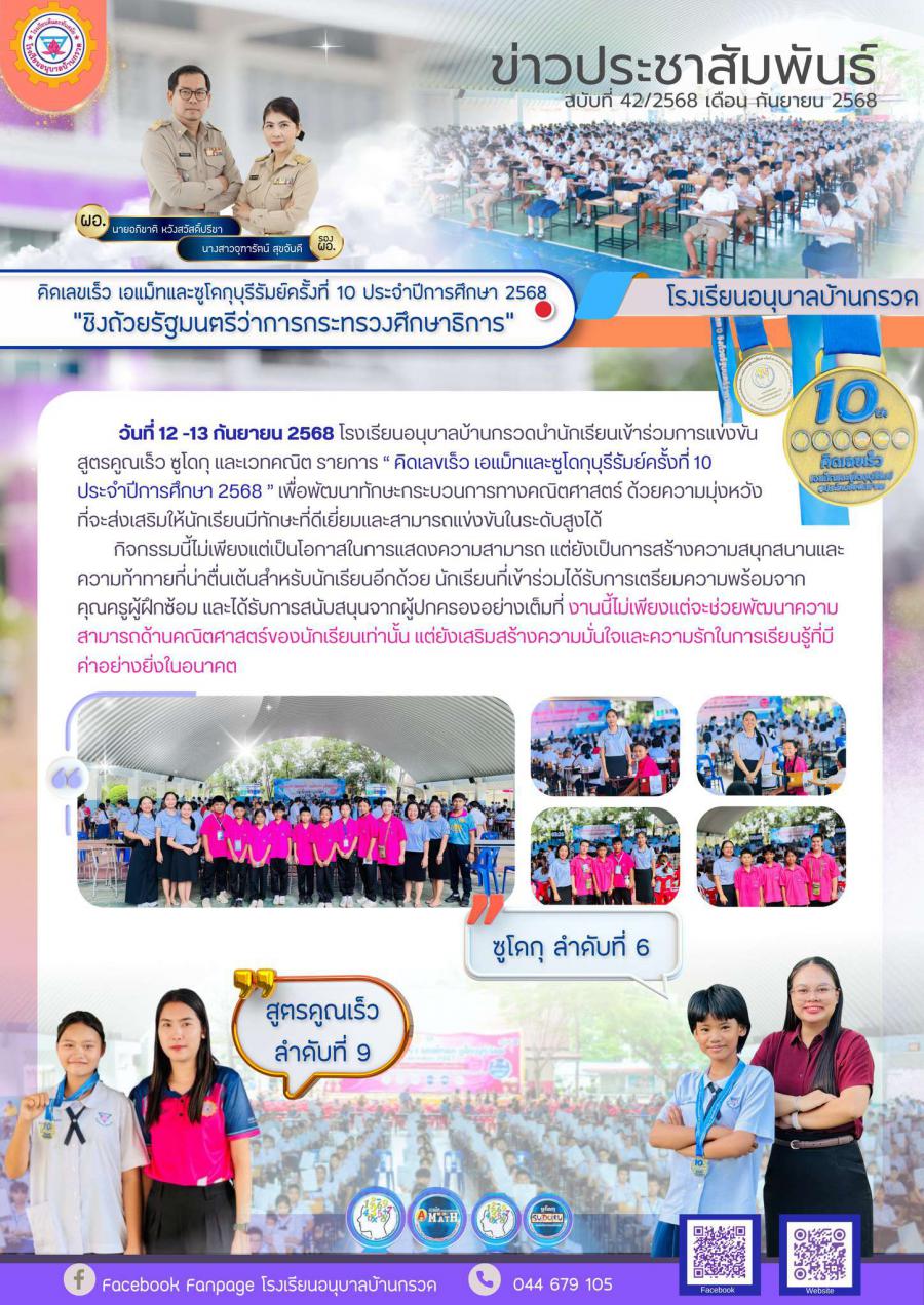 วันที่ 12 -13 กันยายน 2568 โรงเรียนอนุบาลบ้านกรวดนำนักเรียนเข้าร่วมการแข่งขัน สูตรคูณเร็ว ซูโดกุ และเวทคณิต รายการ “ คิดเลขเร็ว เอแม็ทและซูโดกุบุรีรัมย์ครั้งที่ 10 ประจำปีการศึกษา 2568 ” เพื่อพัฒนาทักษะกระบวนการทางคณิตศาสตร์ ด้วยความมุ่งหวังที่จะส่งเสริมให้นักเรียนมีทักษะที่ดีเยี่ยมและสามารถแข่งขันในระดับสูงได้