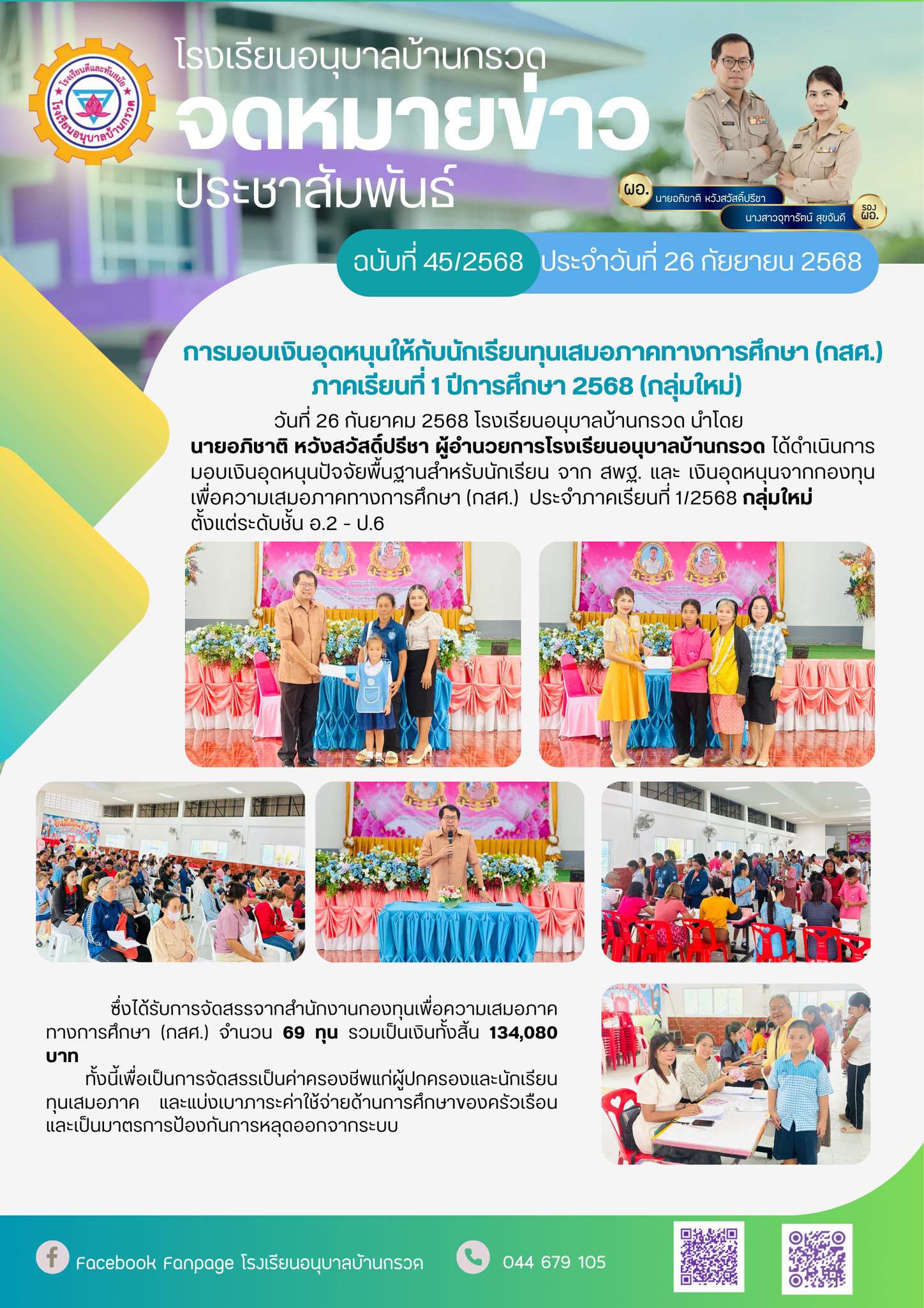 ซึ่งได้รับการจัดสรรจากสำนักงานกองทุนเพื่อความเสมอภาคทางการศึกษา (กสศ.) จำนวน 69 ทุน รวมเป็นเงินทั้งสิ้น 134,080 บาท