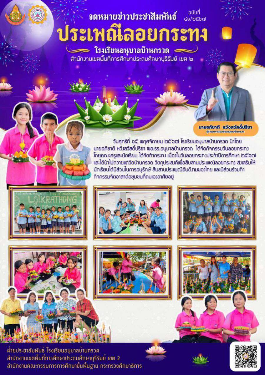 วันที่ 15 พฤศจิกายน 2567 โรงเรียนอนุบาลบ้านกรวด ได้จัดกิจกรรมวันลอยกระทง โดยคณะครูและนักเรียน ได้จัดทำกระทง เนื่องในวันลอยกระทงประจำปีการศึกษา 2567 และได้นำไปถวายแด่วัดบ้านกรวด เพื่อสืบสานประเพณีลอยกระทง ส่งเสริมให้นักเรียนได้มีส่วนในการอนุรักษ์ สืบสานประเพณีอันดีงามของไทย และมีส่วนร่วมทำกิจกรรมจิตอาสาต่อชุมชนที่ตนเองอาศัยอยู่