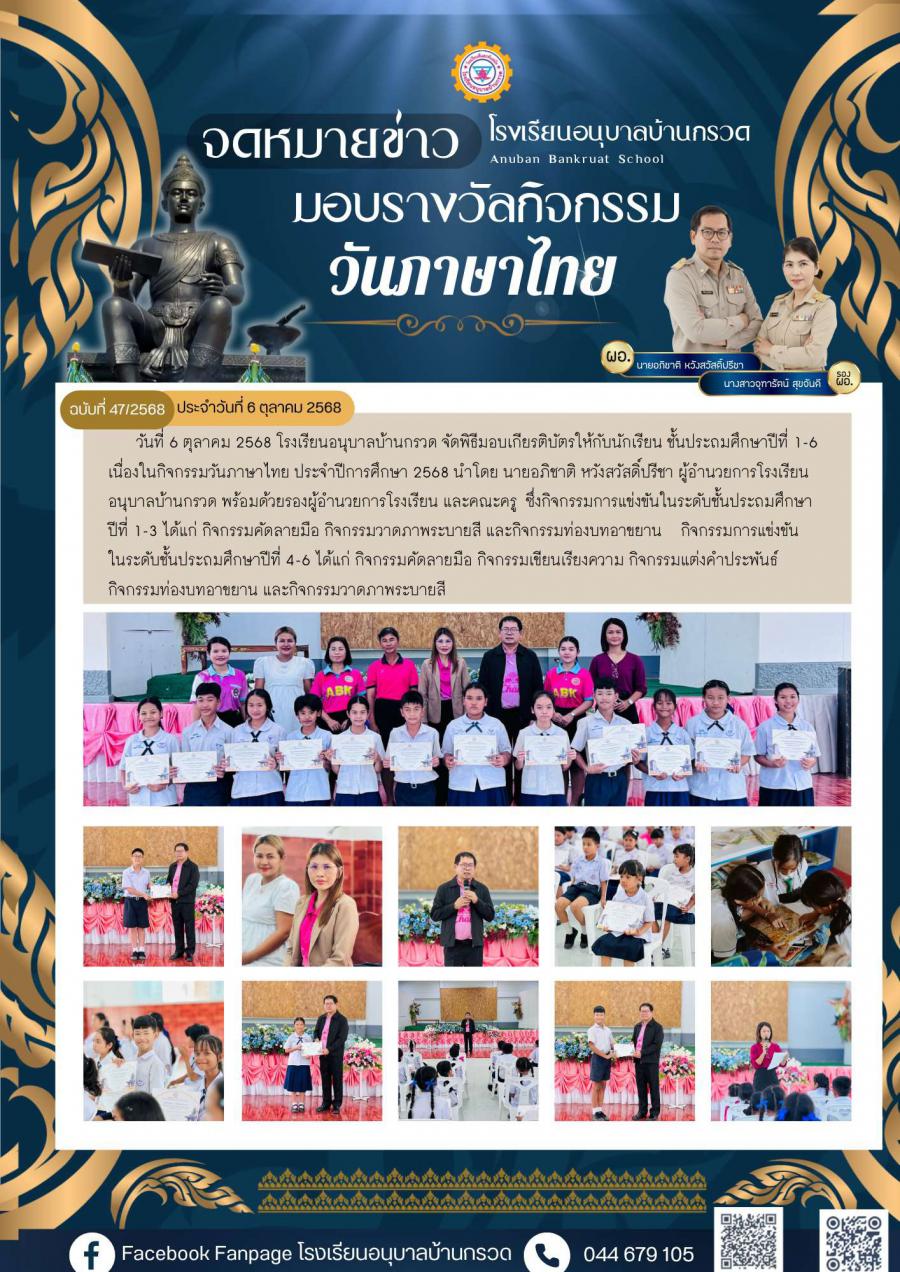 วันที่ 6 ตุลาคม 2568 โรงเรียนอนุบาลบ้านกรวด จัดพิธีมอบเกียรติบัตรให้กับนักเรียน ชั้นประถมศึกษาปีที่ 1-6 เนื่องในกิจกรรมวันภาษาไทย ประจำปีการศึกษา 2568 นำโดย นายอภิชาติ หวังสวัสดิ์ปรีชา ผู้อำนวยการโรงเรียนอนุบาลบ้านกรวด พร้อมด้วยรองผู้อำนวยการโรงเรียน และคณะครู ซึ่งกิจกรรมการแข่งขันในระดับชั้นประถมศึกษาปีที่ 1-3 ได้แก่ กิจกรรมคัดลายมือ กิจกรรมวาดภาพระบายสี และกิจกรรมท่องบทอาขยาน กิจกรรมการแข่งขันในระดับชั้นประถมศึกษาปีที่ 4-6 ได้แก่ กิจกรรมคัดลายมือ กิจกรรมเขียนเรียงความ กิจกรรมแต่งคำประพันธ์ กิจกรรมท่องบทอาขยาน และกิจกรรมวาดภาพระบายสี