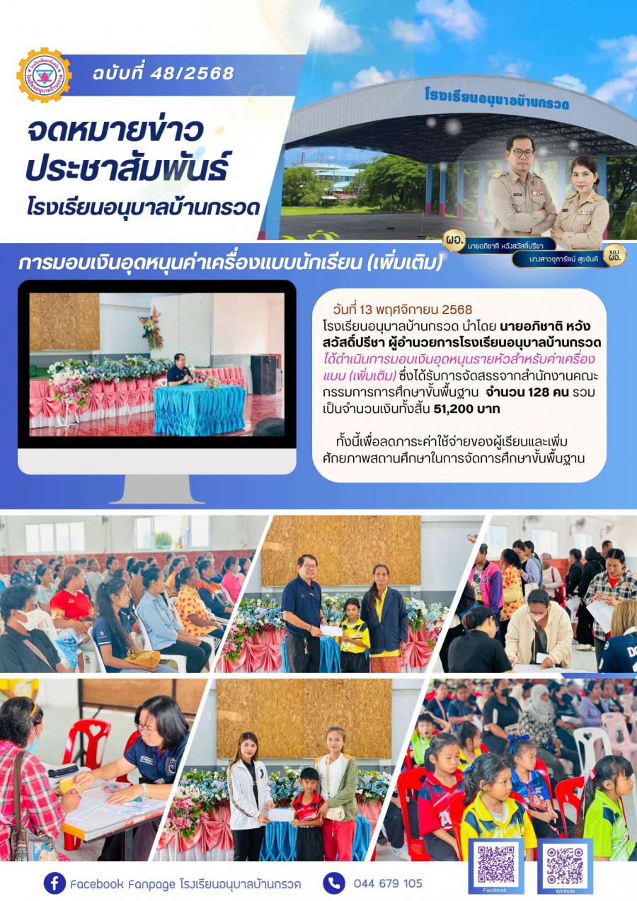 โรงเรียนอนุบาลบ้านกรวด นำโดย นายอภิชาติ หวังสวัสดิ์ปรีชา ผู้อำนวยการโรงเรียนอนุบาลบ้านกรวด ได้ดำเนินการมอบเงินอุดหนุนรายหัวสำหรับค่าเครื่องแบบ (เพิ่มเติม) ซึ่งได้รับการจัดสรรจากสำนักงานคณะกรรมการการศึกษาขั้นพื้นฐาน จำนวน 128 คน รวมเป็นจำนวนเงินทั้งสิ้น 51,200 บาท