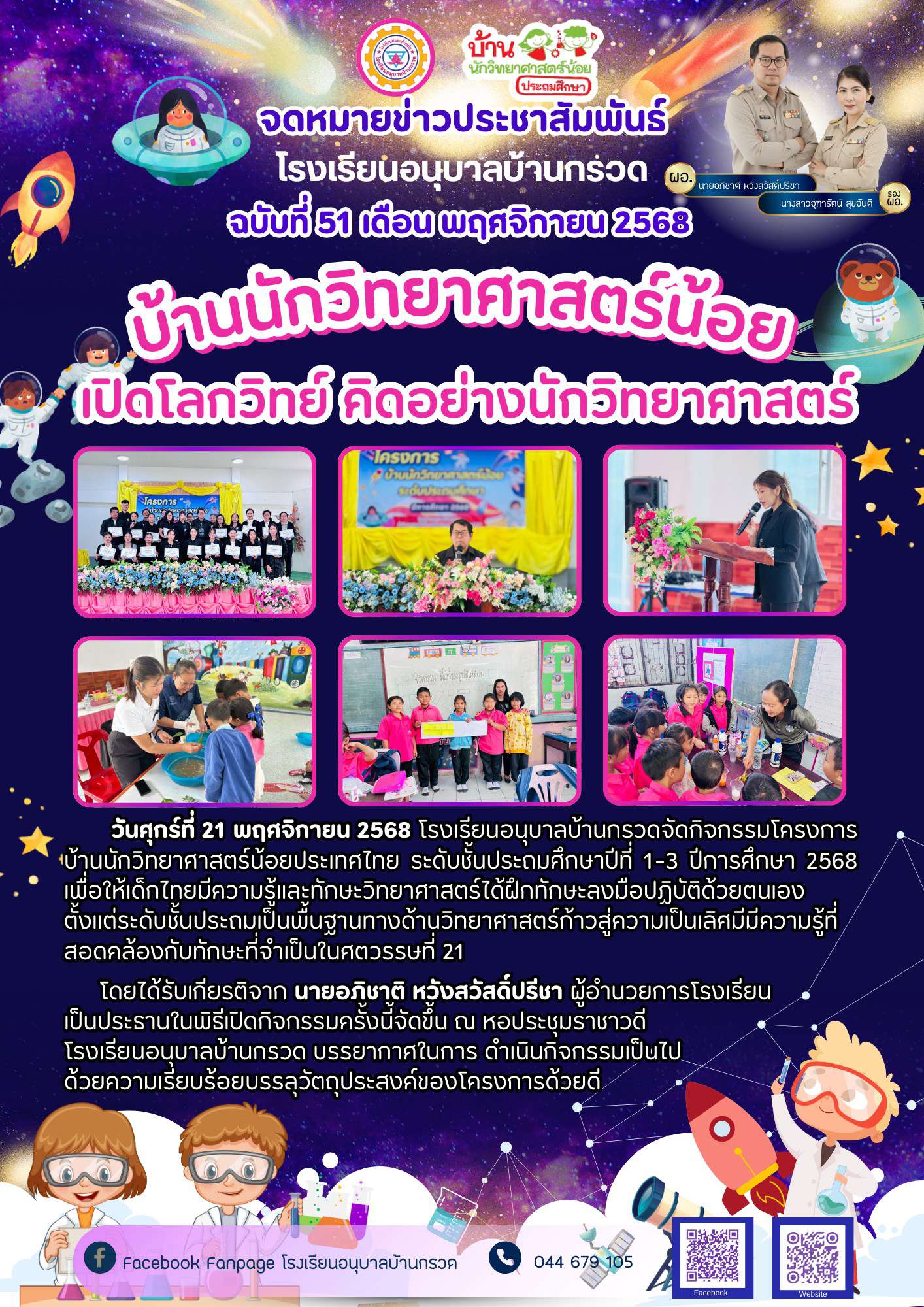 วันศุกร์ที่ 21 พฤศจิกายน 2568 โรงเรียนอนุบาลบ้านกรวดจัดกิจกรรมโครงการบ้านนักวิทยาศาสตร์น้อยประเทศไทย ระดับชั้นประถมศึกษาปีที่ 1-3 ปีการศึกษา 2568 เพื่อให้เด็กไทยมีความรู้และทักษะวิทยาศาสตร์ได้ฝึกทักษะลงมือปฏิบัติด้วยตนเองตั้งแต่ระดับชั้นประถมเป็นพื้นฐานทางด้านวิทยาศาสตร์ก้าวสู่ความเป็นเลิศมีมีความรู้ที่สอดคล้องกับทักษะที่จำเป็นในศตวรรษที่ 21