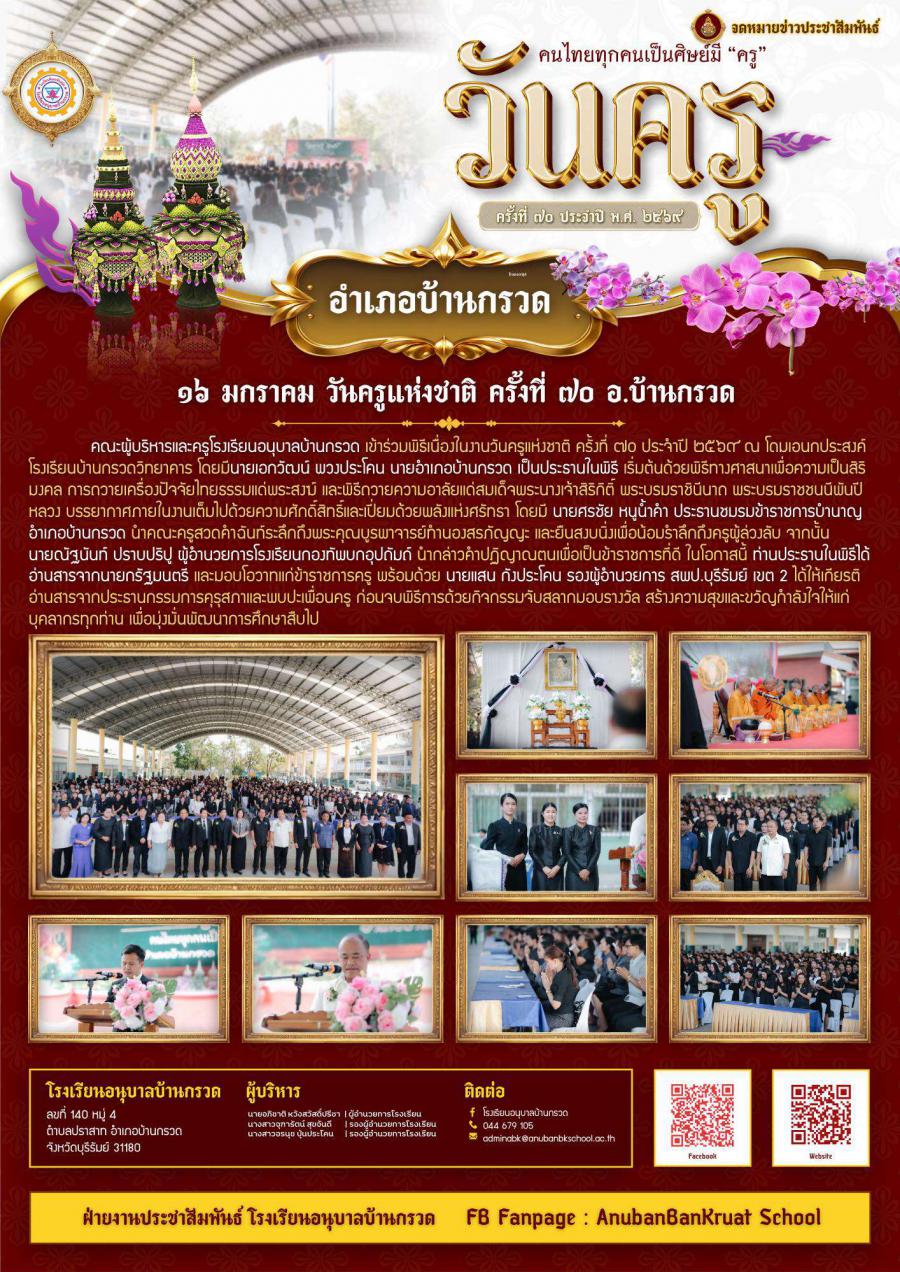 เมื่อวันที่ 16 มกราคม 2569 คณะผู้บริหารและครูโรงเรียนอนุบาลบ้านกรวด เข้าร่วมพิธีเนื่องในงานวันครูแห่งชาติ ครั้งที่ 70 ประจำปี 2569 ณ โดมเอนกประสงค์ โรงเรียนบ้านกรวดวิทยาคาร