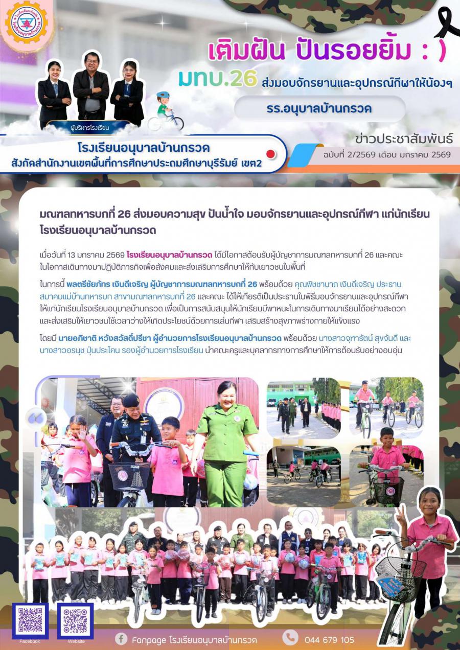 เมื่อวันที่ 13 มกราคม 2569 ณ โรงเรียนอนุบาลบ้านกรวด พลตรีชัยภัทร เงินดีเจริญ ผู้บัญชาการมณฑลทหารบกที่ 26 และคุณพิชชานาถ เงินดีเจริญ ประธานสมาคมแม่บ้านทหารบก สาขา มทบ.26 ได้ให้เกียรติเป็นประธานมอบจักรยานและอุปกรณ์กีฬาเพื่อการศึกษาและพลานามัยแก่นักเรียน