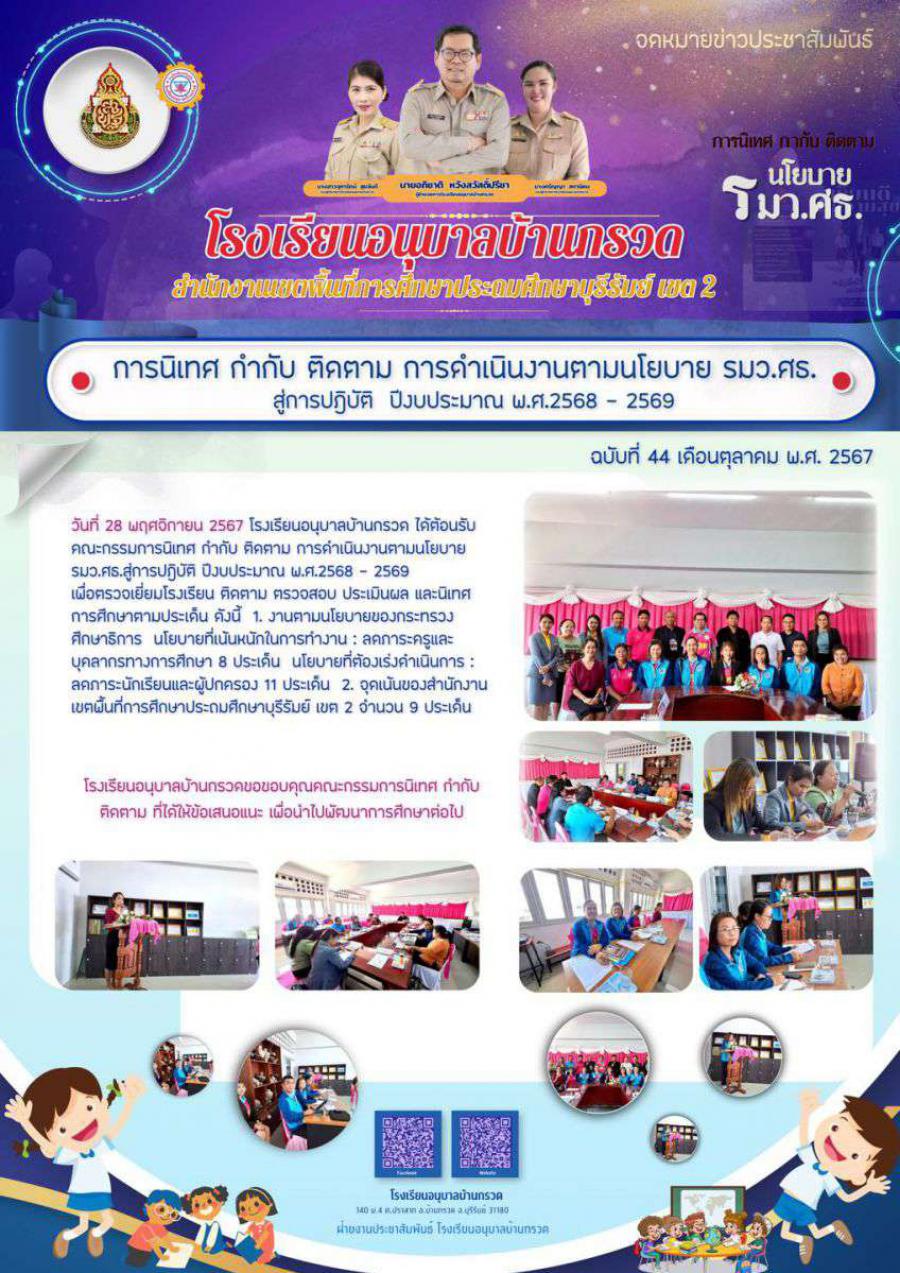 วันที่ 28 พฤศจิกายน 2567 โรงเรียนอนุบาลบ้านกรวด ได้ต้อนรับคณะกรรมการนิเทศ กำกับ ติดตาม การดำเนินงานตามนโยบายรมว.ศธ.สู่การปฎิบัติ ปีงบประมาณ พ.ศ.2568 - 2569 เพื่อตรวจเยี่ยมโรงเรียน ติดตาม ตรวจสอบ ประเมินผล และนิเทศการศึกษาตามประเด็น ดังนี้ 1. งานตามนโยบายของกระทรวงศึกษาธิการ นโยบายที่เน้นหนักในการทำงาน : ลดภาระครูและบุคลากรทางการศึกษา 8 ประเด็น นโยบายที่ต้องเร่งดำเนินการ : ลดภาระนักเรียนและผู้ปกครอง 11 ประเด็น 2. จุดเน้นของสำนักงานเขตพื้นที่การศึกษาประถมศึกษาบุรีรัมย์ เขต 2 จำนวน 9 ประเด็น