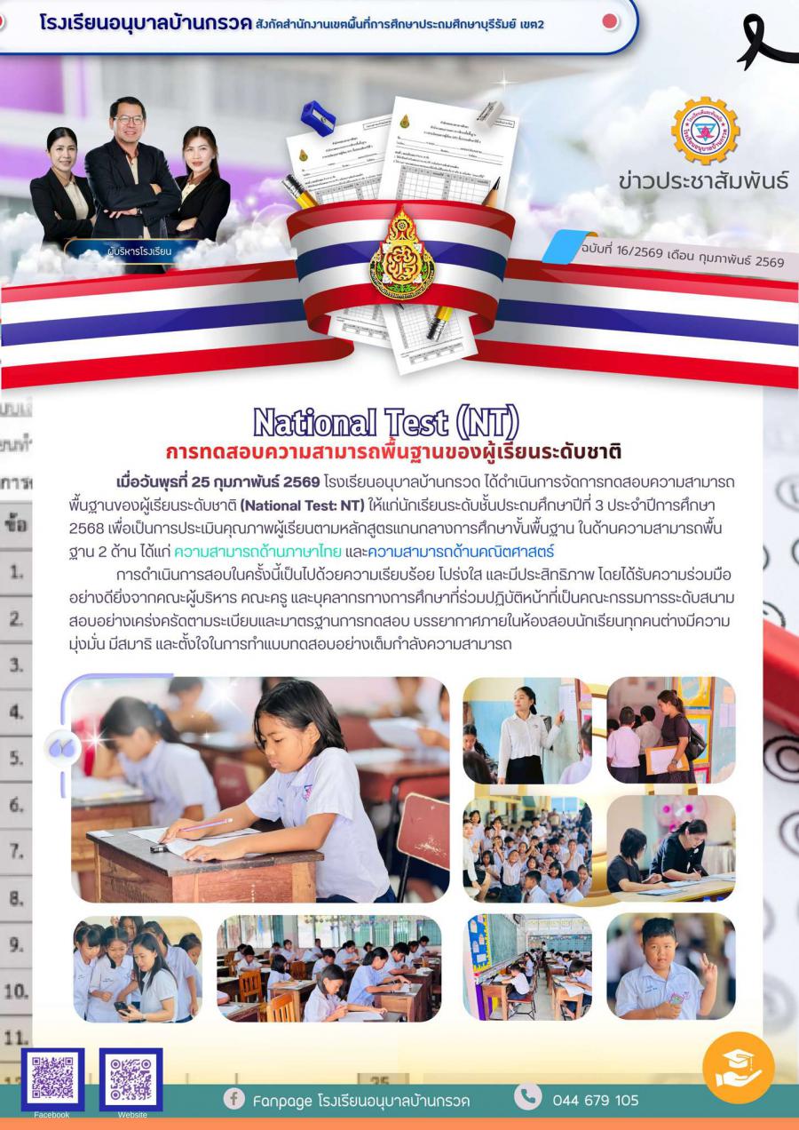 เมื่อวันพุธที่ 25 กุมภาพันธ์ 2569 โรงเรียนอนุบาลบ้านกรวด ได้ดำเนินการจัดการทดสอบความสามารถพื้นฐานของผู้เรียนระดับชาติ (National Test: NT) ให้แก่นักเรียนระดับชั้นประถมศึกษาปีที่ 3 ประจำปีการศึกษา 2568 เพื่อเป็นการประเมินคุณภาพผู้เรียนตามหลักสูตรแกนกลางการศึกษาขั้นพื้นฐาน ในด้านความสามารถพื้นฐาน 2 ด้าน ได้แก่ ความสามารถด้านภาษาไทย และความสามารถด้านคณิตศาสตร์การดำเนินการสอบในครั้งนี้เป็นไปด้วยความเรียบร้อย โปร่งใส และมีประสิทธิภาพ โดยได้รับความร่วมมืออย่างดียิ่งจากคณะผู้บริหาร คณะครู และบุคลากรทางการศึกษาที่ร่วมปฏิบัติหน้าที่เป็นคณะกรรมการระดับสนามสอบอย่างเคร่งครัดตามระเบียบและมาตรฐานการทดสอบ บรรยากาศภายในห้องสอบนักเรียนทุกคนต่างมีความมุ่งมั่น มีสมาธิ และตั้งใจในการทำแบบทดสอบอย่างเต็มกำลังความสามารถ