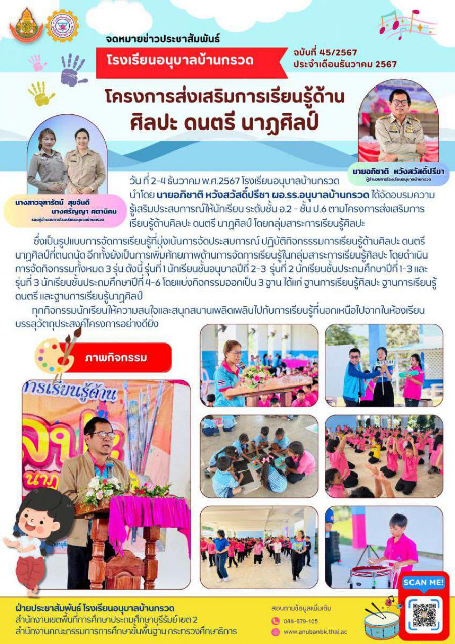 วันที่ 2-4 ธันวาคม 2567 โรงเรียนอนุบาลบ้านกรวด ได้จัดอบรมความรู้เสริมประสบการณ์ให้นักเรียน ระดับชั้น อ.2 - ชั้น ป.6 ตามโครงการส่งเสริมการเรียนรู้ด้านศิลปะ ดนตรี นาฏศิลป์ โดยกลุ่มสาระการเรียนรู้ศิลปะ ซึ่งเป็นรูปแบบการจัดการเรียนรู้ที่มุ่งเน้นการจัดประสบการณ์ ปฏิบัติกิจกรรรมการเรียนรู้ด้านศิลปะ ดนตรี นาฏศิลป์ที่ตนถนัด อีกทั้งยังเป็นการเพิ่มศักยภาพด้านการจัดการเรียนรู้ในกลุ่มสาระการเรียนรู้ศิลปะ ทุกกิจกรรมนักเรียนให้ความสนใจและสนุกสนานเพลิดเพลินไปกับการเรียนรู้ที่นอกเหนือไปจากในห้องเรียนบรรลุวัตถุประสงค์โครงการอย่างดียิ่ง