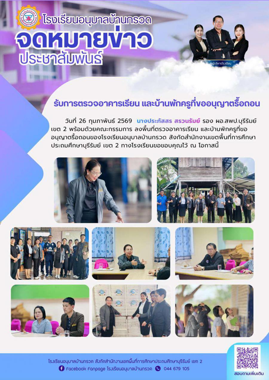 วันที่ 26 กุมภาพันธ์ 2569 นางประภัสสร สรวนรัมย์ รอง ผอ.สพป.บุรีรัมย์ เขต 2 พร้อมด้วยคณะกรรมการ ลงพื้นที่ตรวจอาคารเรียน และบ้านพักครูที่ขออนุญาตรื้อถอนของโรงเรียนอนุบาลบ้านกรวด สังกัดสำนักงานเขตพื้นที่การศึกษาประถมศึกษาบุรีรัมย์ เขต 2 ทางโรงเรียนขอขอบคุณไว้ ณ โอกาสนี้