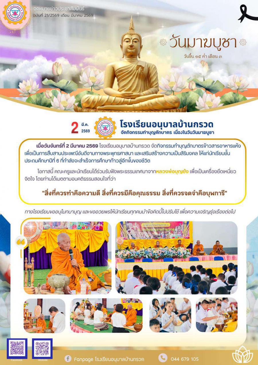 เมื่อวันจันทร์ที่ 2 มีนาคม 2569 โรงเรียนอนุบาลบ้านกรวด จัดกิจกรรมทำบุญตักบาตรข้าวสารอาหารแห้ง เพื่อเป็นการสืบสานประเพณีอันดีงามทางพระพุทธศาสนา และเสริมสร้างความเป็นสิริมงคลให้แก่นักเรียนชั้นประถมศึกษาปีที่ 6 ที่กำลังจะสำเร็จการศึกษาก้าวสู่อีกขั้นของชีวิต
