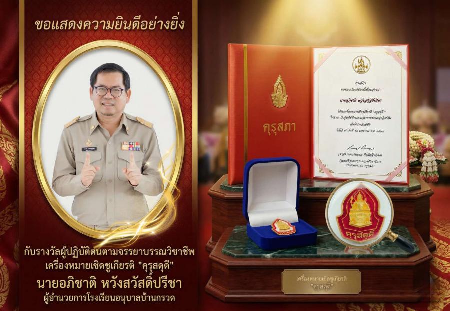 โรงเรียนอนุบาลบ้านกรวด ขอแสดงความยินดีกับ นายอภิชาติ หวังสวัสดิ์ปรีชา ผู้อำนวยการโรงเรียนอนุบาลบ้านกรวด ในโอกาสอันเป็นมงคลที่ได้รับการพิจารณาคัดเลือกให้ได้รับเครื่องหมายเชิดชูเกียรติ "คุรุสดุดี" ในฐานะผู้ปฏิบัติตนตามจรรยาบรรณวิชาชีพดีเยี่ยม